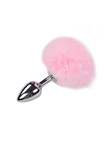 Plug anal en métal, modèle Small 7 x 2,8 cm, forme lisse, surmonté d'un pompon rose en fourrure synthétique.