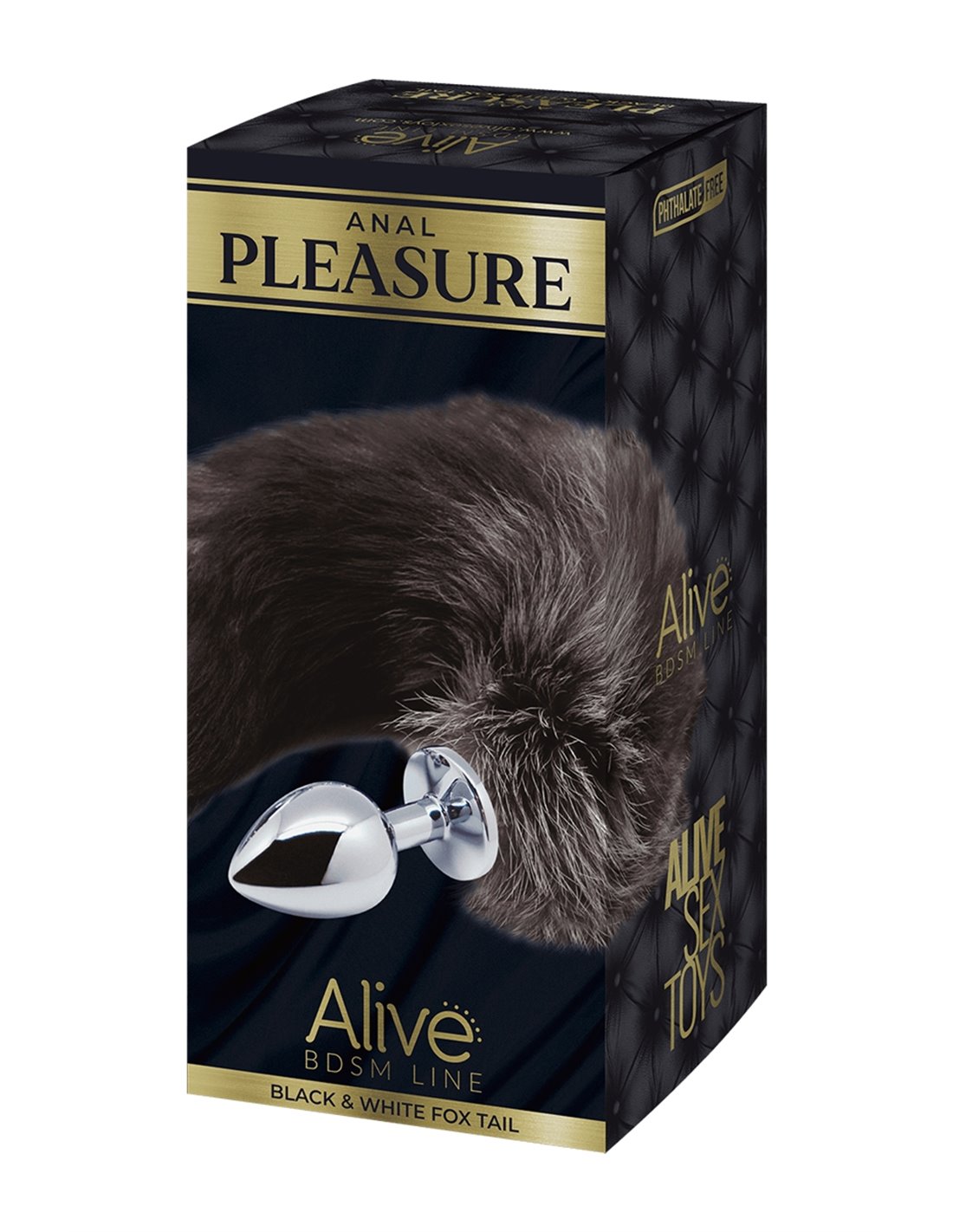 La marque Alive présente "Anal Pleasure Black & White Fox Tail", un plug anal en métal original avec une extrémité imitant une queue de renard noire et blanche. Plug taille medium.