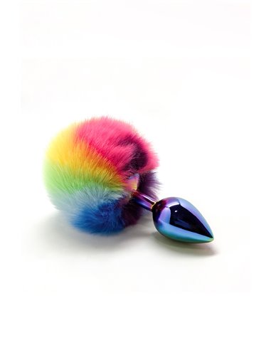 Plug anal en métal, modèle Small 7 x 2,8 cm, surmonté d'un pompon en fourrure synthétique, plug et pompon couleur Raimbow Flag.
