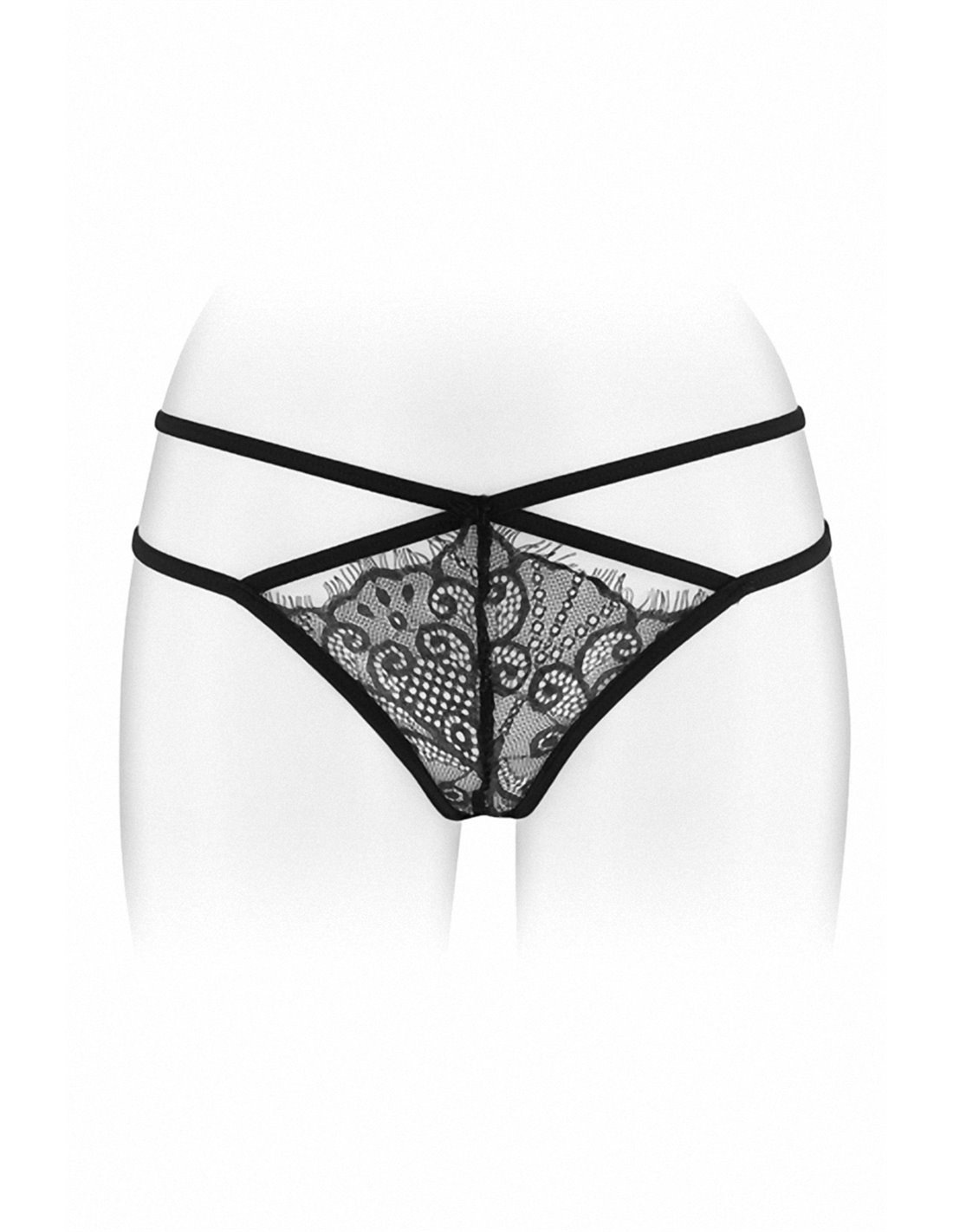 String noir à la fois sophistiqué et coquin, ouvert à l'entre-jambes, avec motif en dentelle et bandes croisées, par la marque de lingerie libertine Fashion Secret.