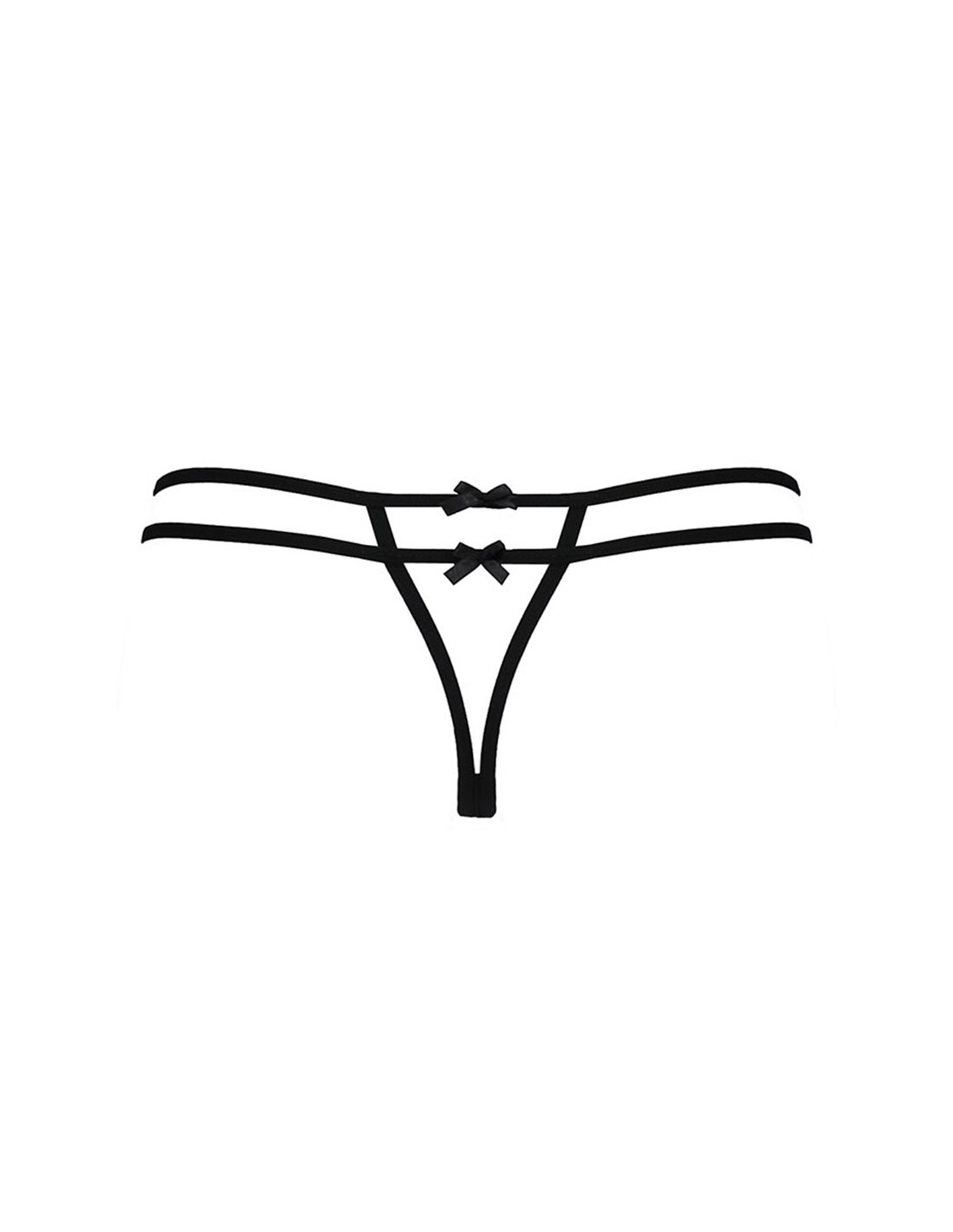 Structuré par des lanières noires joliment agencées derrière et soulignées par deux petits noeuds coquins, le string ouvert met toujours parfaitement en valeur les attirantes rondeurs du fessier.