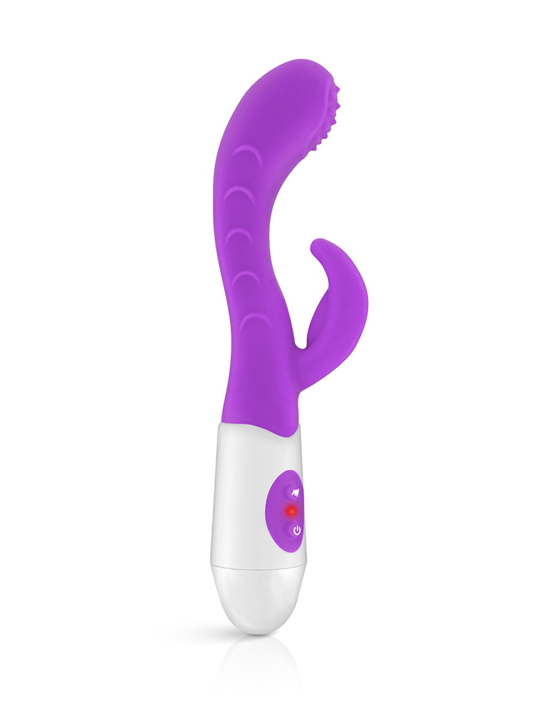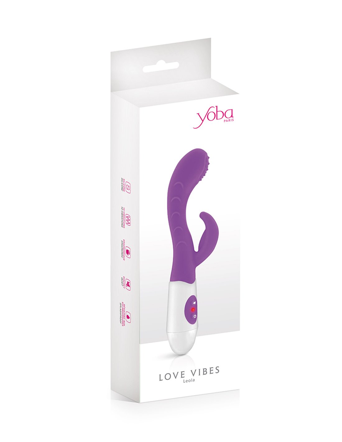 Le vibromasseur Rabbit Leola (coloris violet) de la marque Yoba est un sextoy de qualité dédié au plaisir féminin. Il stimule en même temps le vagin, tout particulièrement la zone du point G grâce à sa forme incurvée et sa tête avec tête arrondie dotée de picots, et le clitoris grâce à son petit ergot stimulant judicieusement placé.